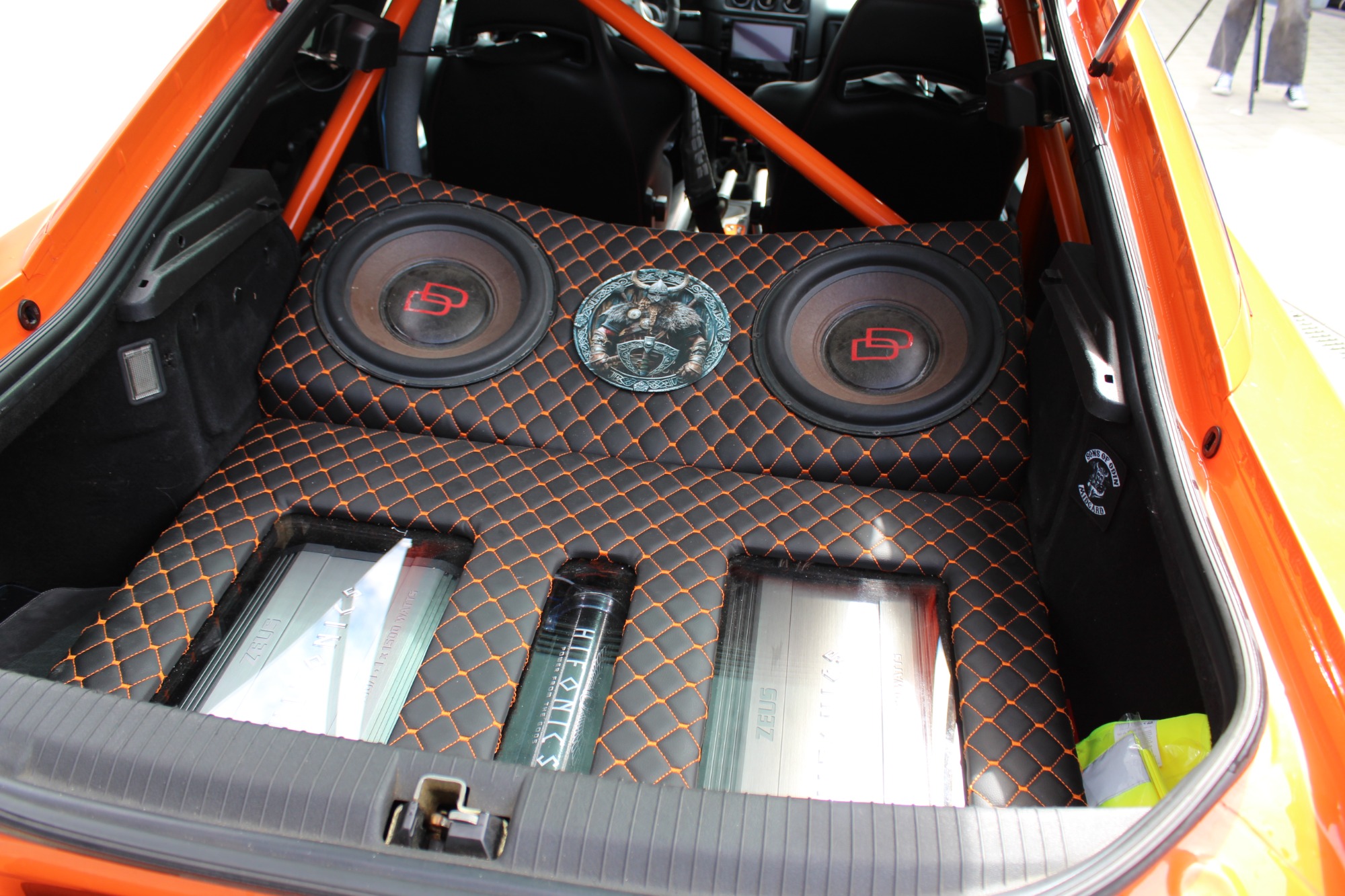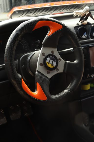 Schwarze Lenk Tuning Teppich mit orangenem Keder